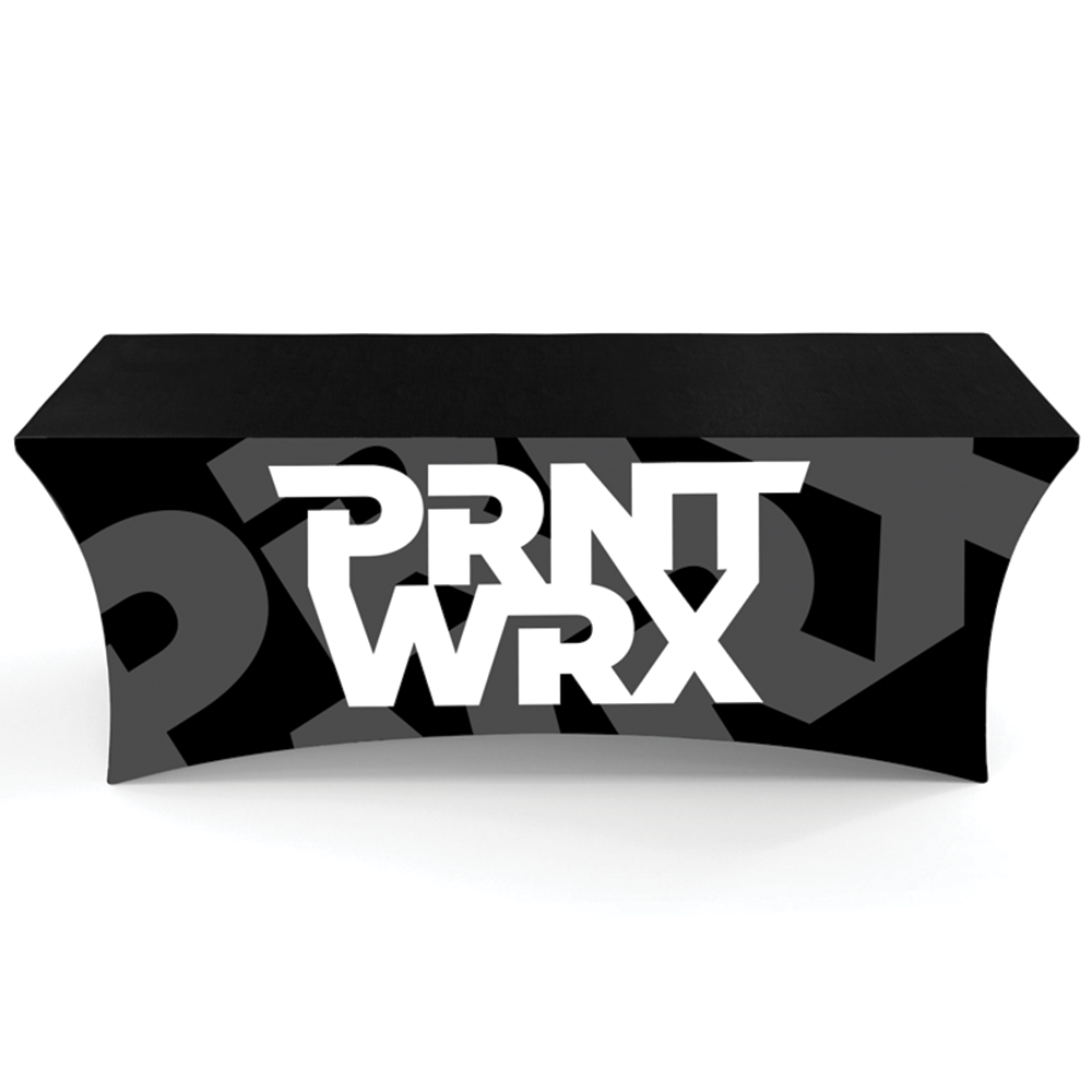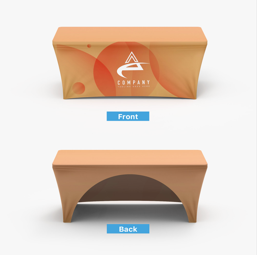 Enhance your brand presence at your next show, event, or presentation with our fully customized dye-sublimated Flex-Fit Table Cover. Designed to fit snugly over standard tables, it delivers a clean, professional look every time. Made from durable 240g polyester, this cover is machine washable and flame-retardant for long-lasting use. Each table cover is custom printed with your unique graphics and logo to make your display stand out.
